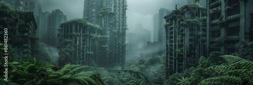 © Joyce, Obraz premium Abandoned city debris with green plants growing. Post apocalypse scene.