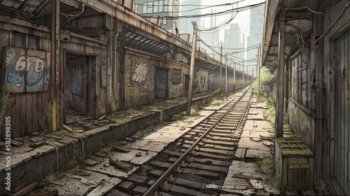 © Hero Design, Obraz premium Abandoned city railway background. Anime cartoon style drawing. Generative AI technology.