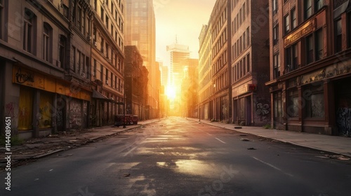 Fototapeta premium Abandoned city street at dawn with soft light filtering through empty...