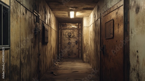 Fototapeta premium Abandoned Corridor with Doors and Rusty Walls