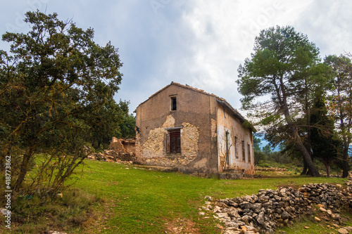 © MiguelAngel, Obraz premium abandoned country house in a Mediterranean forest, on a cloudy day.