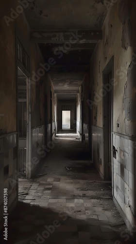 © Cookiezkiez, Fototapeta premium Abandoned Dark Hallway in Dilapidated Building