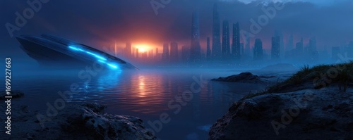 © PBMasterDesign, Naklejka premium Abandoned destroyed city in apocalyptic wasteland concept. Futuristic landscape with an alien ship and glowing city lights.