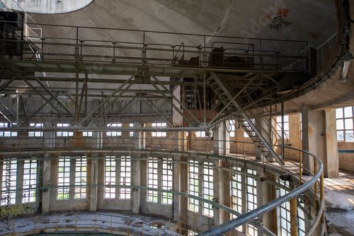 © Arkadiusz, Obraz premium Abandoned distillery tower in Italy – circular industrial building with glass dome, steel beams, panoramic windows, decaying factory interior, urban exploration, post-industrial architecture