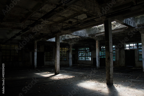 Obraz premium Abandoned, empty industrial hall with dirty walls