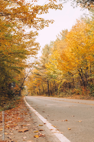 © anoushkatoronto, Obraz premium Abandoned empty road street in colorful autumn forest park with yellow orange red leaves on trees. Beautiful fall season outdoors.