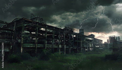 © Digital Dreams Studi, Obraz premium Abandoned Factory Under Dark Ominous Clouds