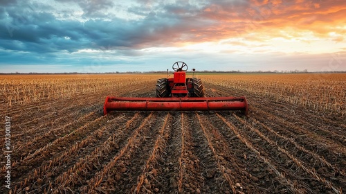 Fototapeta premium Abandoned farm fields with broken machinery, overgrown crops, rural societal collapse, moody lighting
