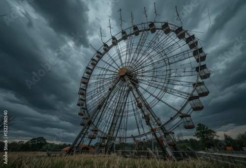 © Kitta Studio, Fototapeta premium Abandoned Ferris Wheel Against Dramatic Sky in Rural Setting