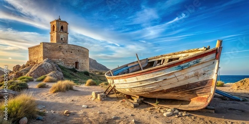 © Manatsavee, Obraz premium Abandoned Fishing Boat & San Miguel Tower, Cabo de Gata, Spain - Double Exposure