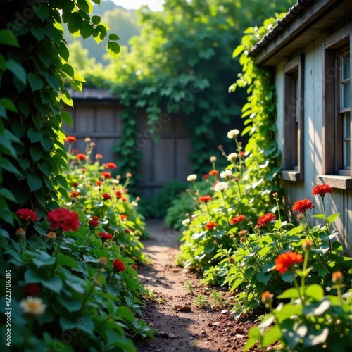 © Phennapha, Naklejka premium Abandoned garden with overgrown flowers and weeds, neglected , green