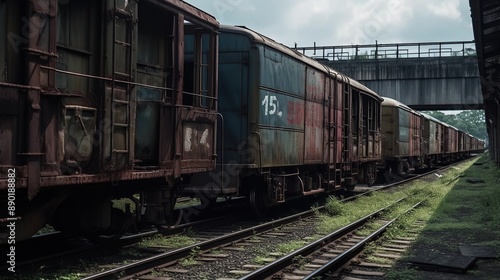 Fototapeta premium Abandoned goods train station with weathered train wagons under cloudy sky