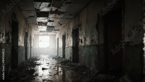 © melisasaputri, Fototapeta premium Abandoned hallway with peeling paint and debris.