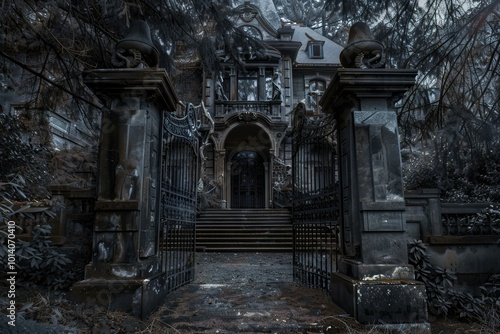 Fototapeta premium Abandoned haunted mansion with a dark and eerie atmosphere behind iron gates
