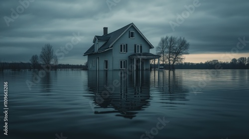 Fototapeta premium Abandoned house in calm floodwaters under dramatic sky