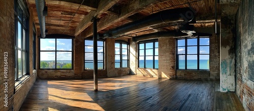 © Rayhan, Obraz premium Abandoned Industrial Building Interior With City View