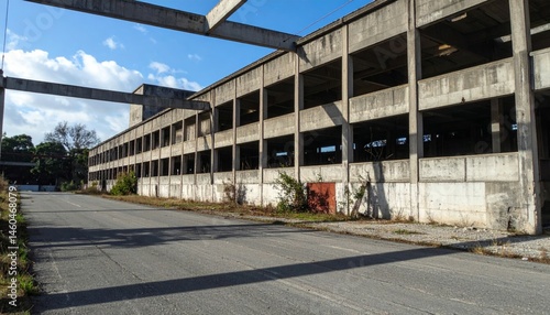 Obraz premium Abandoned Industrial Building with Concrete Walls and Blue Sky