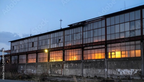 Obraz premium Abandoned Industrial Building with Warm Light Reflection at Dusk