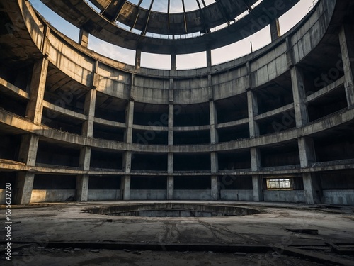 © Andreas, Fototapeta premium Abandoned Industrial Cooling Tower Interior With Dramatic Light Shafts