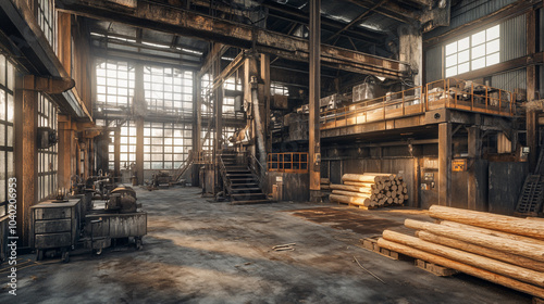 © Panida, Fototapeta premium Abandoned Industrial Mill with Wood Logs - Vintage Interior