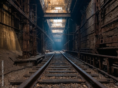 Naklejka premium Abandoned Industrial Mine Shaft With Rusted Railway Tracks