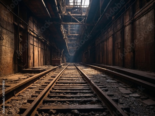 Naklejka premium Abandoned Industrial Mine Shaft With Rusted Railway Tracks