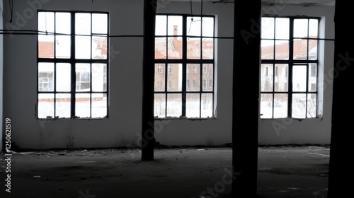 © darion, Fototapeta premium Abandoned industrial space with large windows revealing a snowy landscape.