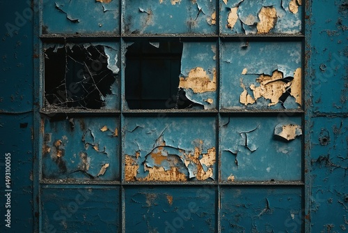 © ZHI, Fototapeta premium Abandoned industrial warehouse with broken windows and dramatic chiaroscuro lighting, showing peeling paint textures and urban decay. Dark atmosphere, perfect for post-apocalyptic or horror themes.
