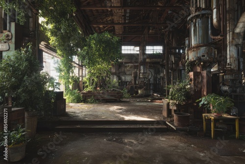 © Oksana Smyshliaeva, Fototapeta premium Abandoned Industrial Warehouse with Overgrown Plants and Rustic Machinery.