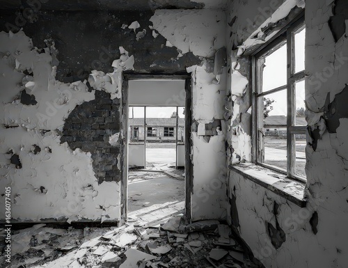 © Rafassyacreative, Obraz premium Abandoned Interior Grayscale Room With Broken Wall And Door