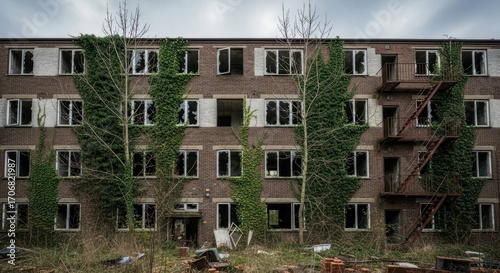 Naklejka premium Abandoned multi-story brick building with broken software, overgrown ivy, and...