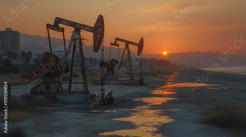 © KarpenArt Studio, Fototapeta premium Abandoned oil pumps line the coastline near rundown buildings at sunset