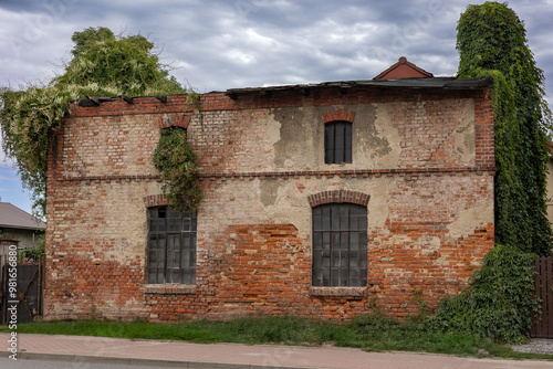 © Volha, Fototapeta premium Abandoned old brick building covered in green ivy with broken windows on a cloudy day.