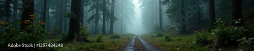 Naklejka premium Abandoned old path winding through fir trees surrounded by dense fog, foggy, trees