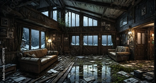 Fototapeta premium abandoned old ski lodge resort interior cabin in the forest snowy mountains...