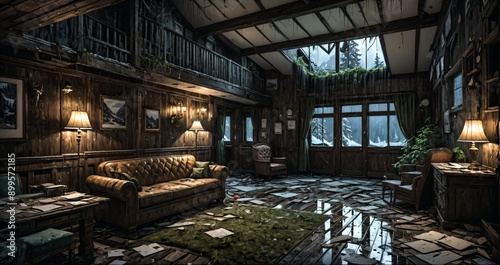 Fototapeta premium abandoned old ski lodge resort interior cabin in the forest snowy mountains...