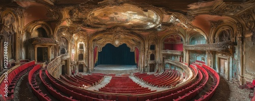 © Svitlana, Obraz premium Abandoned ornate theater with red seats and decaying architecture