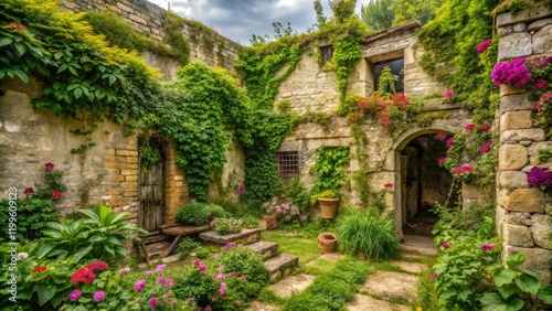 Naklejka premium Abandoned, overgrown garden with vines and flowers crawling up old stone...