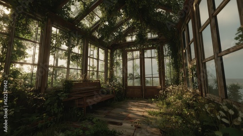 © Kitta Studio, Fototapeta premium Abandoned Overgrown Greenhouse Interior with Nature's Embrace