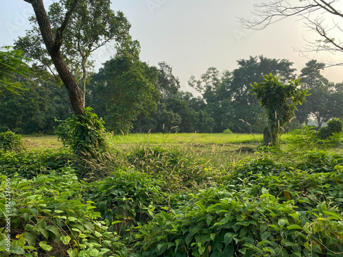 Naklejka premium Abandoned park filled with wild plants, green grass and tree, on morning...