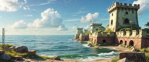 © Things and stuff, Obraz premium abandoned pirate fort overlooking the ocean 3d render scene video game concept background illustration digital artwork