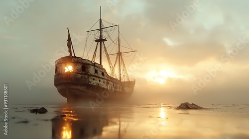 Fototapeta premium 45 Abandoned pirate ship, glowing with cursed gold, eerie fog, Watercolor style