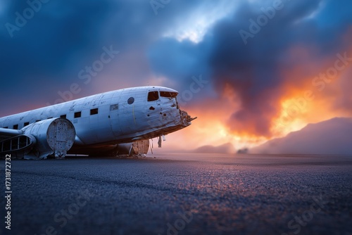 © Iryna, Obraz premium Abandoned plane wreck on rocky terrain at sunset with dramatic smoky sky