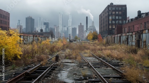 © Ketua, Fototapeta premium Abandoned Railroad Tracks in Front of a City Skyline