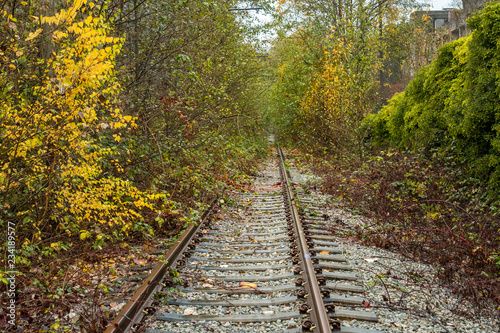 © Yi, Fototapeta premium abandoned railway tracks inside forest covered with fall leaves