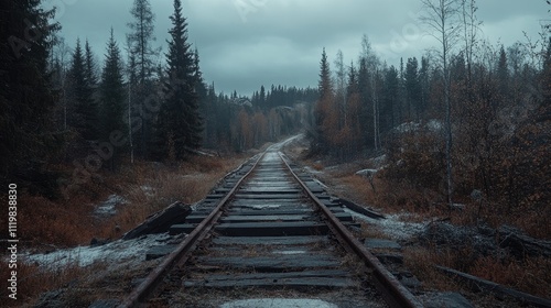 Fototapeta premium Abandoned railway tracks surrounded by a dense forest under a moody sky...