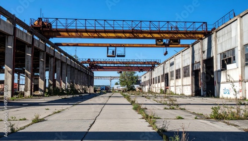 © Tuachan, Fototapeta premium Abandoned Refrigerated Warehouse with Overhead Cranes Under Sun