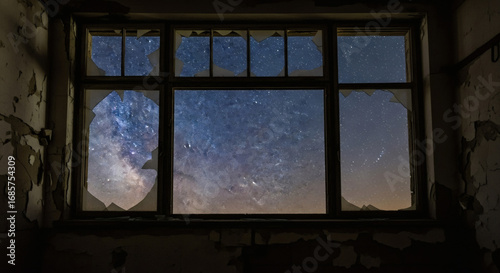 Fototapeta premium Abandoned room view: Milky Way through shattered glass windows at twilight