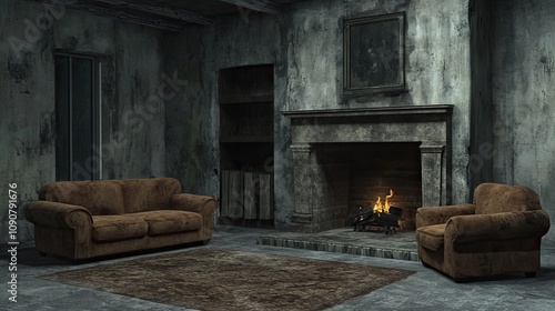 Fototapeta premium Abandoned room with fireplace, sofa, and armchair.