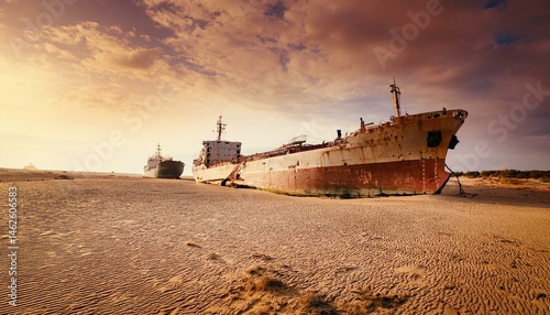 © Simon, Fototapeta premium Abandoned rust ships on dry bottom